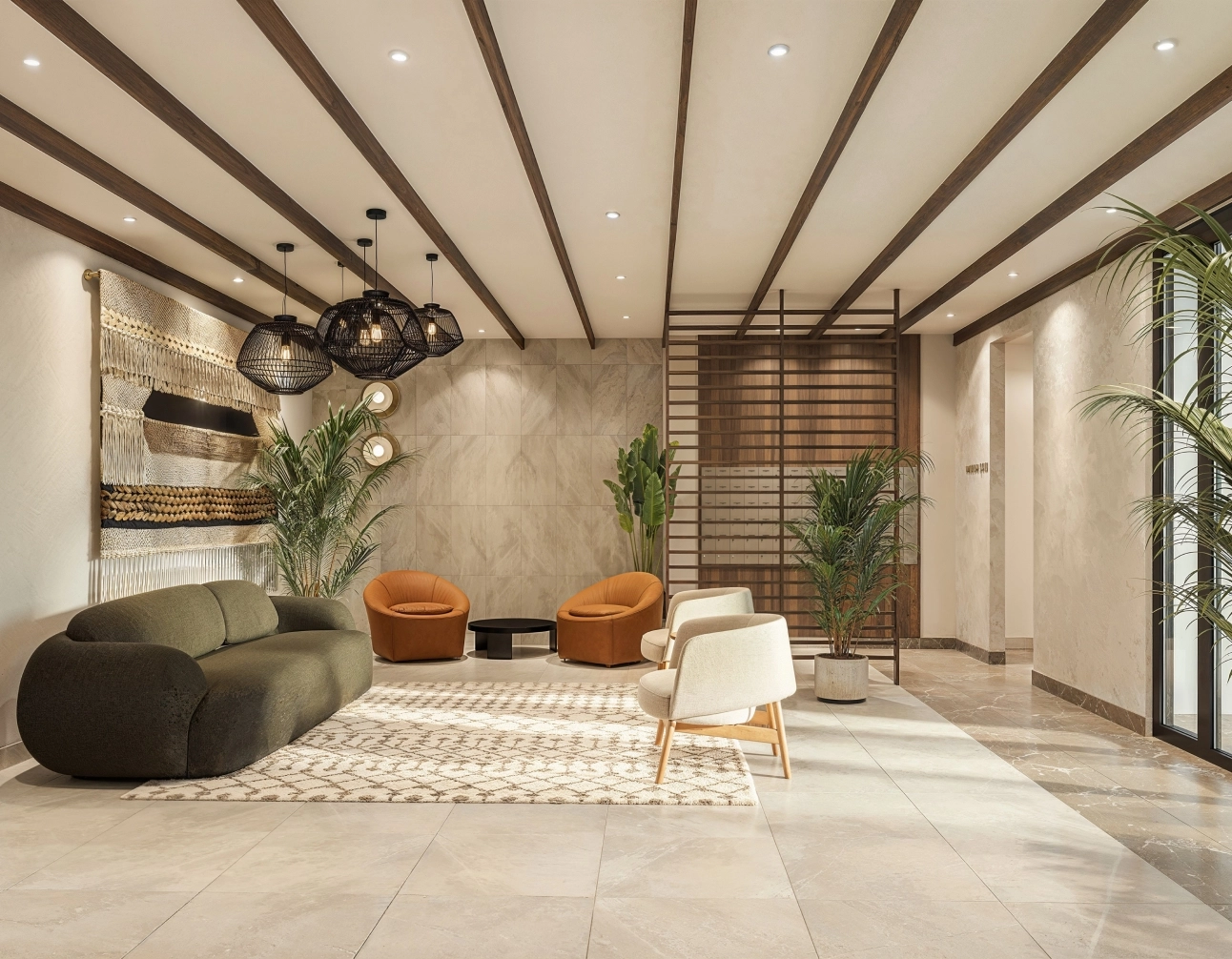 The DUNE building evokes the warmth and tranquility of a desert landscape. The sandy colour brings the common areas to life, providing a simple softness that fosters a welcoming and refined environment. The warm tones blend seamlessly with wooden elements, creating an elegant harmony between modernity and nature.